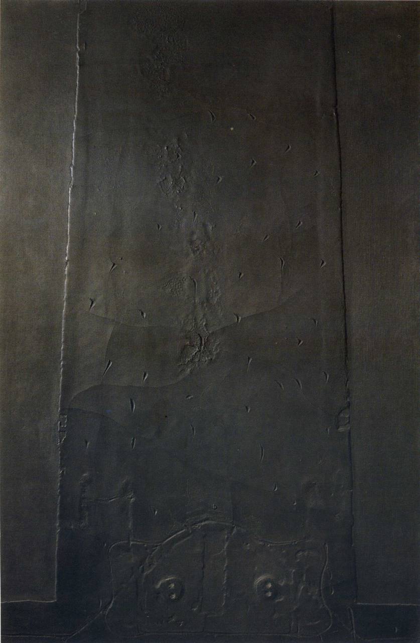 «Relleu sobre cartó» (1956) es la primera obra que se avista nada más abrir la puerta de Elvira González, pero solo es la punta de un iceberg contemporáneo que es el trabajo de Tàpies. Enfrente, «Composició vertical negra» (1960) permanece expectante a que alguien se sumerja en un océano de tela negra.