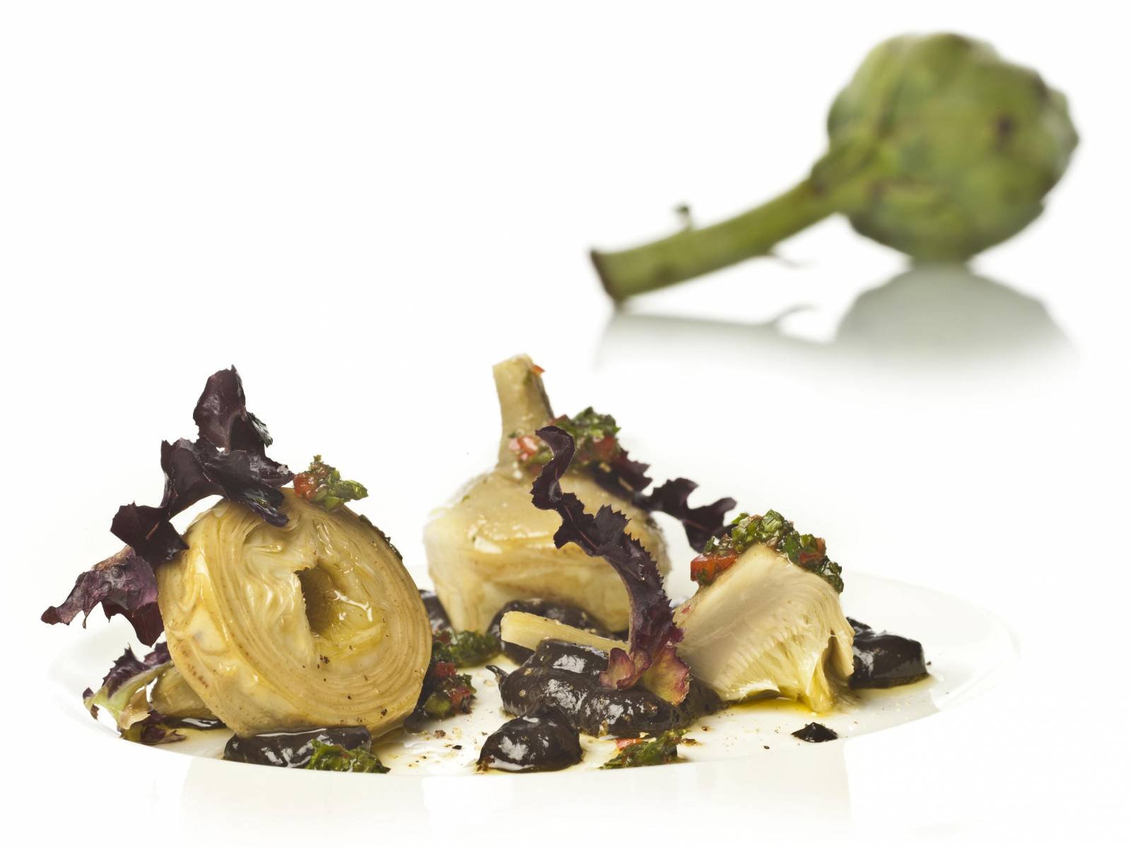 El cocinero madrileño ha apostado al cien por cien por la cocina vegetal. En la imagen, uno de sus platos compuesto por alcachofa, cebolleta y tabulé. Foto: R. R. de la Calle.