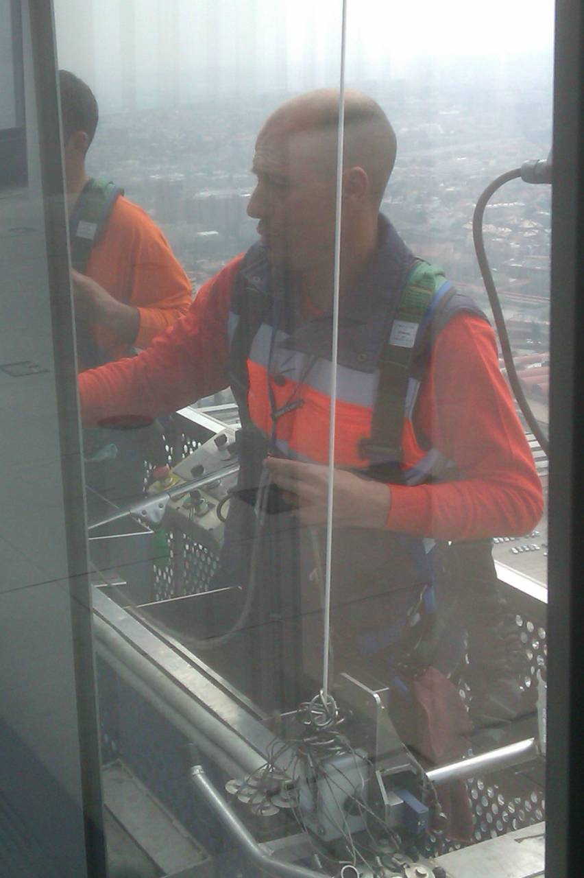 Agustín forma parte del equipo de limpiadores desde que comenzó la actividad de la torre a finales de 2009. Se dedicaba a la prevención de riesgos laborales y realizó un curso para especializarse en trabajos en altura, algo que le metió de lleno en el sector. Antes de entrar en Torre Cristal tuvo que superar todo tipo de requerimientos: «Ascensos, descensos, rescates o actuaciones de emergencia… Además, me realizaron pruebas como un electro, un TAC, revisión de la vista y el oído».