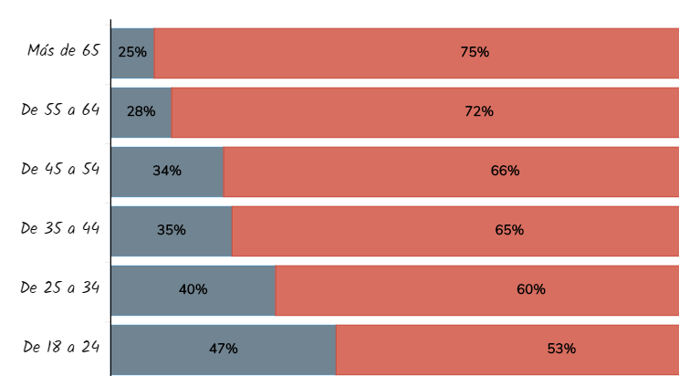 Aunque la tendencia a ejercer el voto se revierte conforme la edad aumenta, en el barómetro del CIS se observa que el sector que va desde los 18 a los 35 son los ciudadanos que menos acuden a votar. Solo un 59,3% de los jóvenes de 25 a 34 años tiene seguro que si irá a la urnas el 10-N. Frente a las franjas que van entre 55 a 64 y mayores de 65, ya que son los que más acuden a los colegios electorales, con un 73,2% y 68,6% respectivamente. «Los mayores votan de forma masiva y por un lado hay una cultura política que hace que los jóvenes perciban la política como algo ajeno y por otro hay una estructura que dice que como esta gente no vota no hay que preocuparse», explica Tojar.