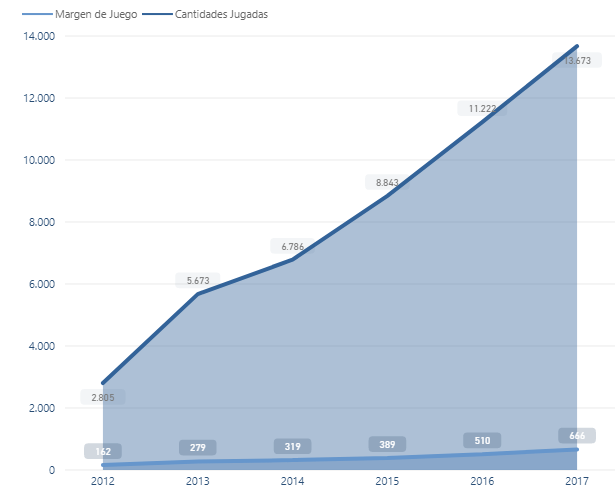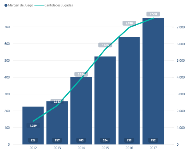 En cuanto a la evolución del total de las apuestas, tanto presenciales como online, han aumentado en España un 444,69 por ciento de 2012 a 2017, ya que ha pasado de 1.389 millones a 7.538 millones de euros.