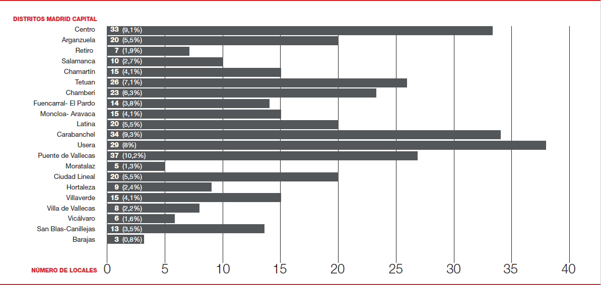 En Madrid capital, como es lógico, se concentra la mayoría de estos locales. En total, a fecha de 30 de septiembre de este año, hay 362 locales de apuestas en todo Madrid, donde el 10,2 por ciento de estas se concentran en el distrito de Puente de Vallecas, que cuenta con 37 locales. La siguiente zona que más negocios de este tipo tiene es Carabanchel, con 34 locales. En contraposición, el distrito de Barajas solo concentra el 0,8 por ciento de estos locales, tres únicamente, seguido de Moratalaz, con cinco, y Vicálvaro con seis.