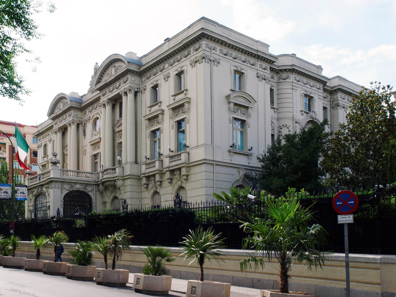 La Embajada del país mediterráneo se encuentra entre las calles Lagasca y Velázquez. Desde 1939, su sede actual es el palacio de Amboage, que el arquitecto Joaquín Rojí construyó en la segunda década del siglo XX. Inspirado en el barroco francés, el palacio perteneció al marqués de Amboage, cuyo título nobiliario fue concedido por el Vaticano. Obtuvo el primer premio concedido por el Ayuntamiento de Madrid como mejor casa construida de 1918 en la sección de <<hoteles particulares>>. La profusión de elementos ornamentales es un factor a destacar en la arquitectura de la Ambasciatta.