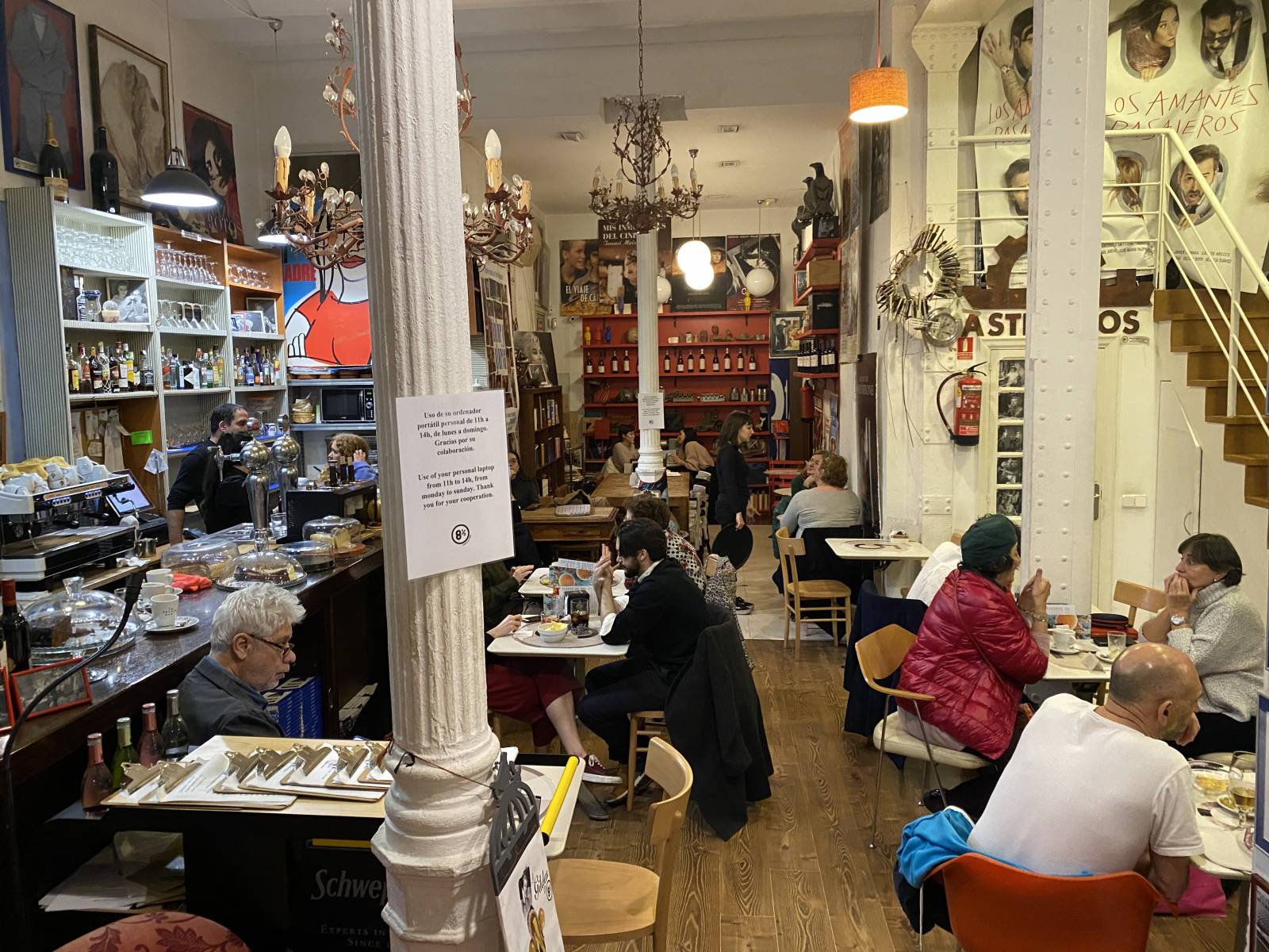 Cuando uno pasea por la zona se pregunta de forma inevitable cómo los cines, los cafés o las librerías no han sido arrollados por el mundo actual, donde todo está a un clic de distancia. «No se le puede poner puertas al campo», comenta María, bilbaína de nacimiento pero asidua de Madrid desde su nacimiento. «Es así, y hay que adaptarse», aunque también reconoce que esto le ha traído alguna que otra discusión con sus compañeros de profesión. La propietaria, que perdió a su marido hace unos años, se ha ido mimetizando para dirigir el negocio. «Yo no sé nada de hostelería ni de llevar un negocio, pero he encontrado a unas personas maravillosas, tras mucha prueba y error, que hacen que esto funcione».
