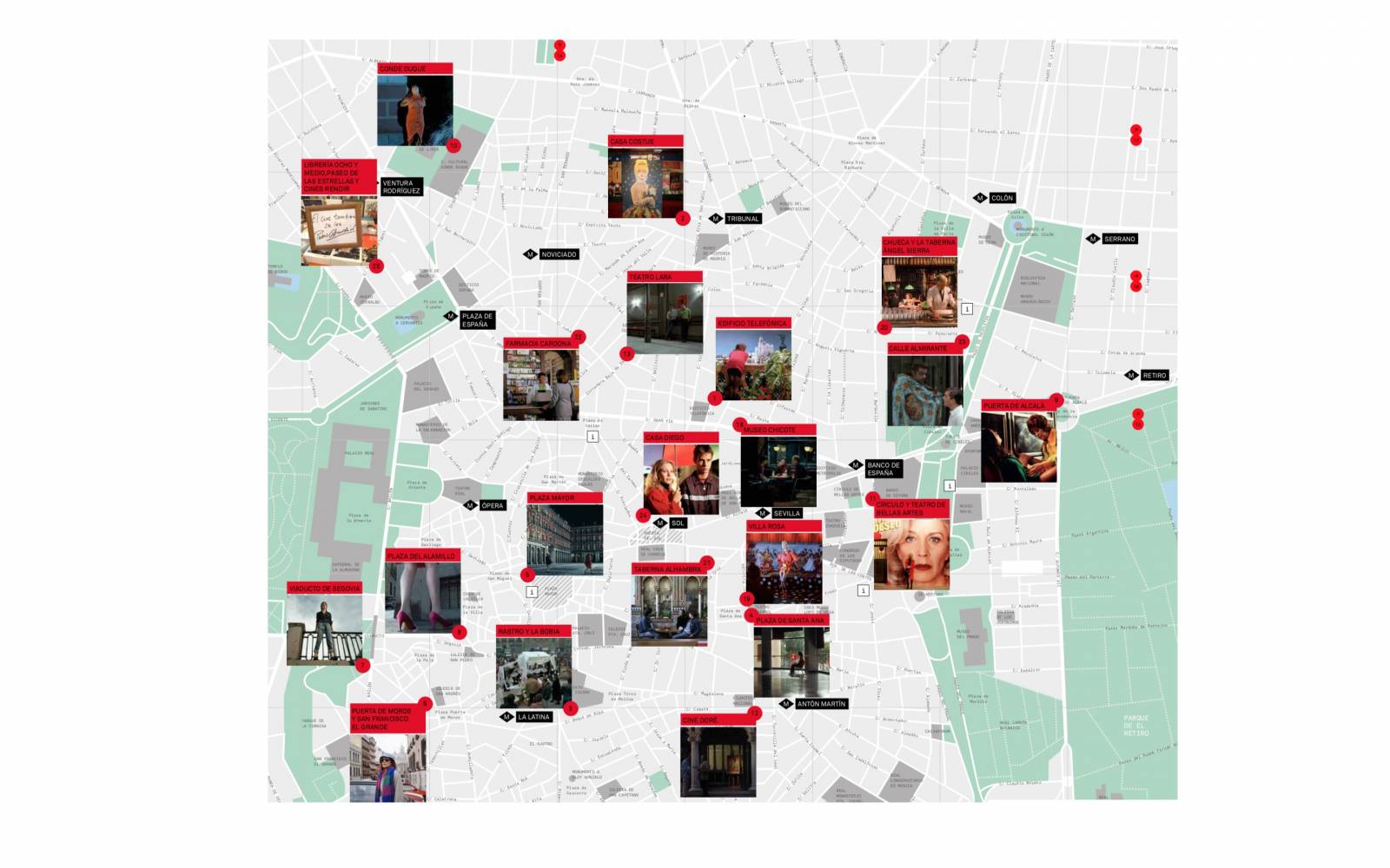 La oficina de turismo de Madrid ha creado una ruta que explora la Madrid de Pedro Almodóvar mediante 25 distintos puntos de la ciudad que se observan en sus films, pasando por Gran Vía y la plaza Santa Ana hasta el cementerio de la Almudena.