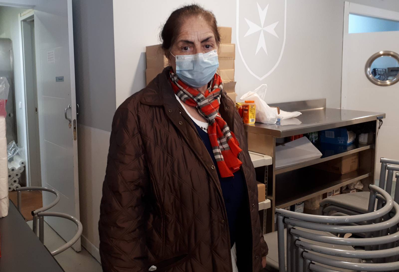 Carmina tiene 70 años y es natural de Salamanca. Define su situación actual de pobreza auténtica, originada por culpa de un accidente que tuvo en 2017 en el que acabó con la cadera rota y que le impidió seguir trabajando. «A partir del accidente, el médico me prohibió todos los esfuerzos, incluso hacer la compra», explica Carmina. Desde entonces, acude a este comedor social, en el que aparte de alimento, también le ofrecen ayuda para asearse, aunque ahora por la pandemia, no está disponible este servicio. «Me dijeron que tenía que tener un baño acondicionado para poder agarrarme y como no lo tengo, también me han ayudado con este tema», aclara.