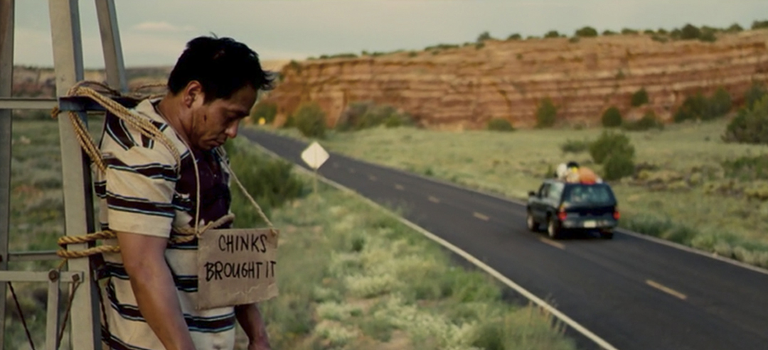 El cine estadounidense también cuenta con una amplia lista de largometrajes donde lo vivido durante la pandemia de 2020 conforma el hilo principal de su argumentación. En Infectados (2009), sin entrar en valoraciones de calidad de la cinta, retrata a un grupo de amigos huyendo de la ciudad hacia la costa por culpa de un virus mortal que ha acabado con parte de la población mundial. Se compone de escenas predictivas en la línea de la española Hablar; una de ellas es la que ilustra este mismo artículo: un hombre colgado a una torreta eólica sostiene un cartel donde se lee « Chinks Brought It (lo han traído los chinos)».