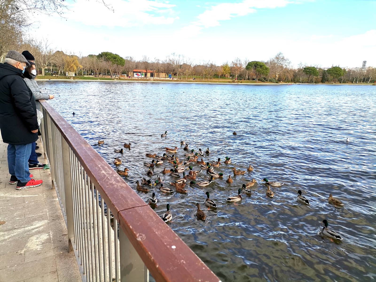 Domingo, once de la mañana. El aparcamiento de la Casa de Campo está completo. Aunque el día ha amanecido nublado y rozando los cero grados —es casi diciembre— decenas de personas se acercan a este gigantesco parque, de unas 1.723 hectáreas, para pasar el día. El centro de todas las miradas es su lago, ubicado junto a la entrada del Paseo de la Puerta del Ángel. Una niña se acerca temerosa a la valla para dejar caer trocitos de pan a sus habitantes: los patos. Esta divertida y tradicional actividad es todo un reclamo no solo para los más pequeños, sino también para los más mayores.