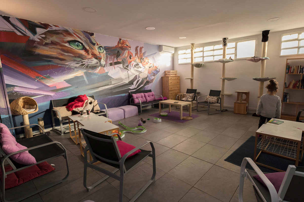 En el año 2013 nacen la Gatoteca y ABRIGA con la intención de ayudar y proteger a los gatos. «Realmente son lo mismo, uno es la asociación y el otro, el establecimiento», explica Eva. Cuando decidió abrir este local, donde humanos y gatos pudiesen interactuar, ella tenía muy claro que no quería que fuese un negocio, sino algo cuyo fin fuese el apoyo a los animales. Para ello pensó en colaborar con alguna asociación, pero vio que era muy complicado generar vínculos, y al final decidió montar la Asociación Benéfica por el Rescate e Inserción de Gatos en Adopción. Poco a poco, el proyecto fue reuniendo a más gente y empezaron a hacerse cargo de la llegada de los gatos. «Siempre nos hemos apoyado en otras asociaciones, ellos no venían directamente de la calle, provenían de otras asociaciones o del centro municipal de Madrid. Cuando llegaban a la Gatoteca pasaban a ser de nuestra posesión y nos encargábamos de hacer la puesta a punto: protocolos veterinarios, manutención, cirugías si eran necesarias y luego todo el proceso de adopción con su posterior seguimiento», relata la fundadora.