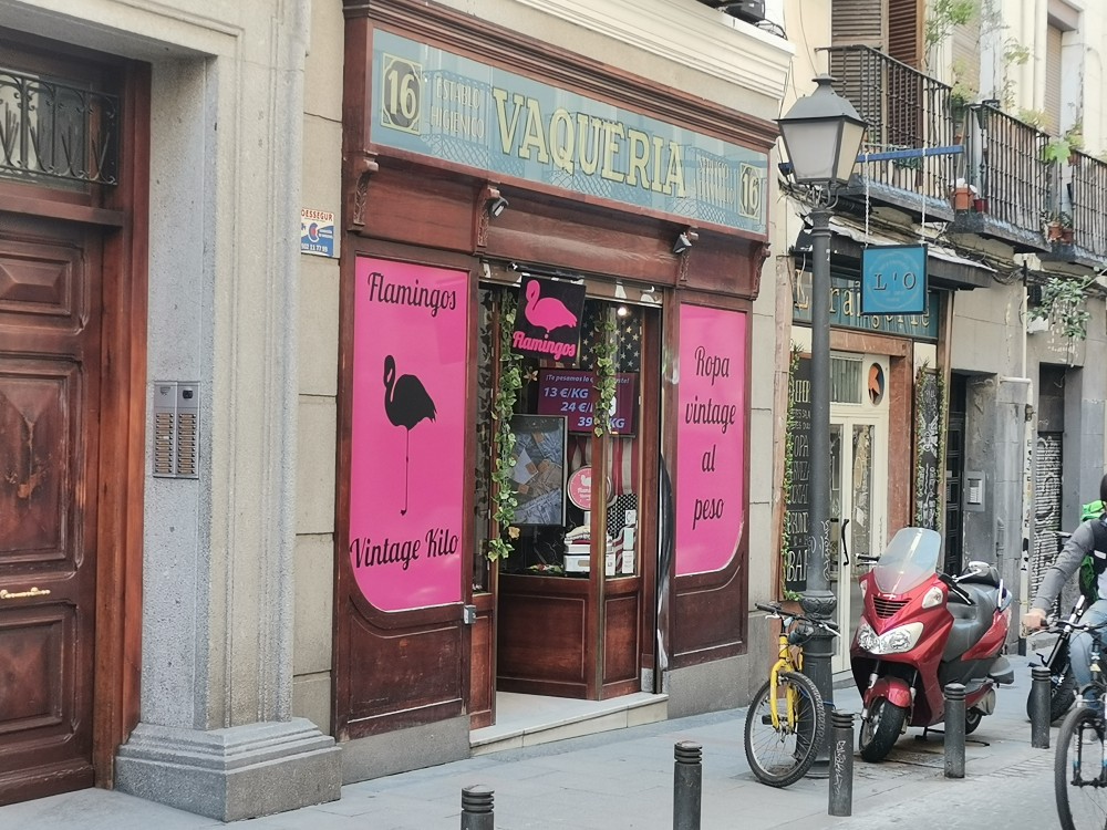 8 años han pasado desde que ‘Flamingos Vintage Kilo’ abrió sus puertas. Ubicada en la calle San Joaquín de Madrid, su característico escaparate rosa atrae la mirada de todo aquel que pasa por delante. A diferencia de otras tiendas similares, aquí la ropa se vende ‘al peso’, es decir, dependiendo de la prenda que elija cada cliente esta variará de precio en función de su peso. «Hay tres categorías: una a 13 euros el kilo, otra a 24 euros el kilo y otra a 39 euros el kilo», explica uno de sus empleados. Ellos siempre han funcionado bastante bien, pero sí que han notado un cambio de edad en la clientela. «Antes no venía tanta gente joven como ahora. Yo creo que es más moda que otra cosa porque la gente encuentra de repente marcas que le gustan y que solo están en estas tiendas», manifiesta el dependiente.