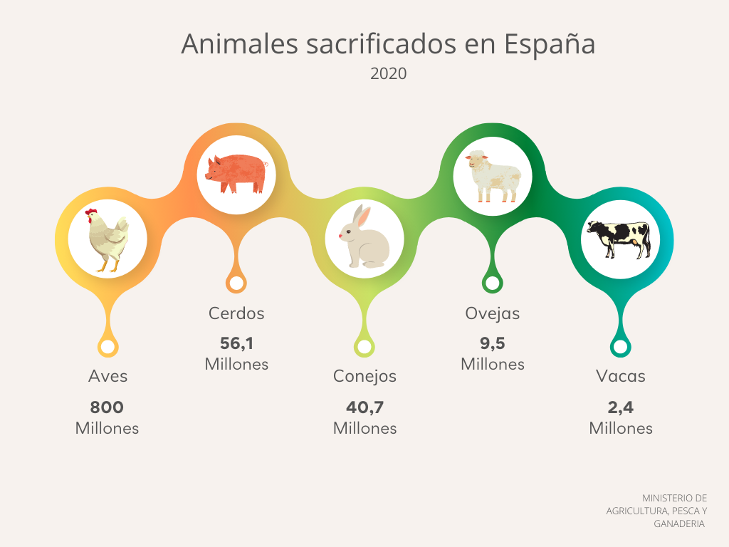 Según los datos del ministerio de agricultura, pesca y alimentación, un total de 910 millones de animales fueron sacrificados el año pasado en los mataderos españoles. 800 millones de aves, 56,1 millones de cerdos, 40,7 millones de conejos, 9,5 millones de ovejas y 2,4 millones de vacas Todos con el fin alimenticio.