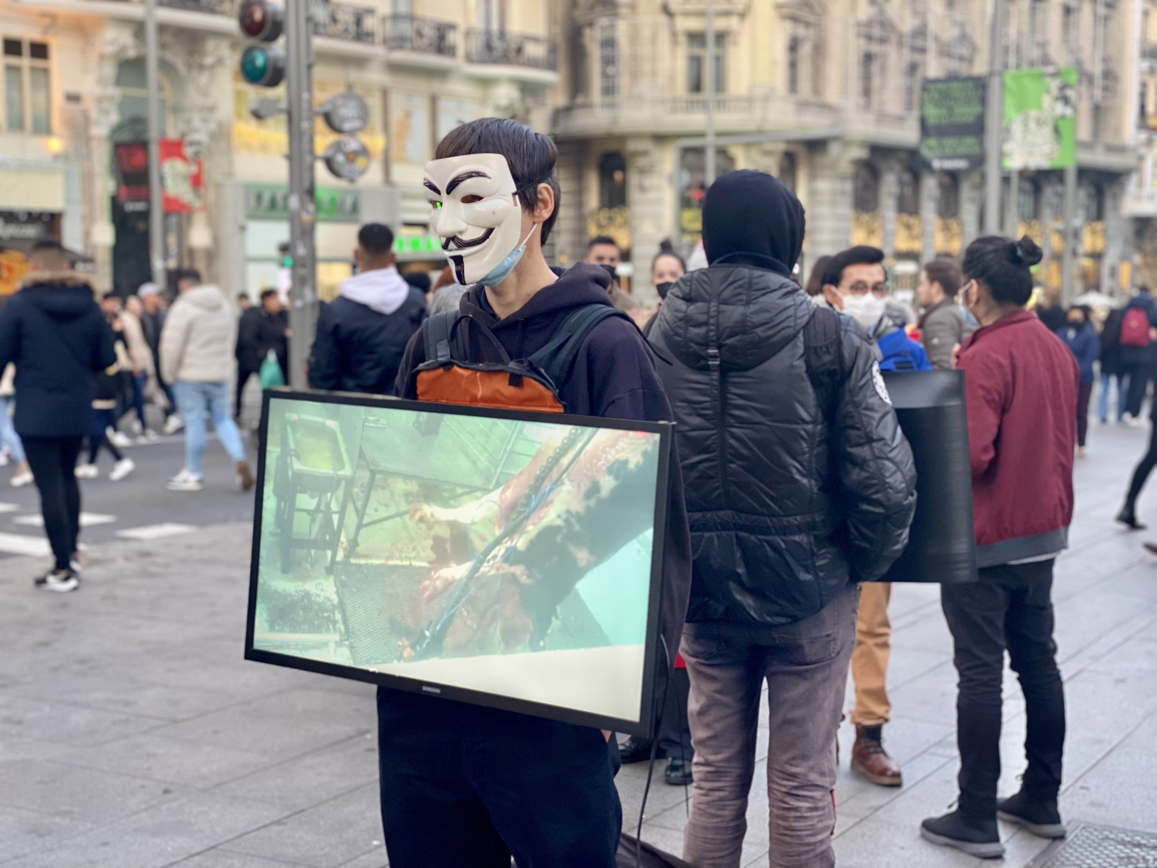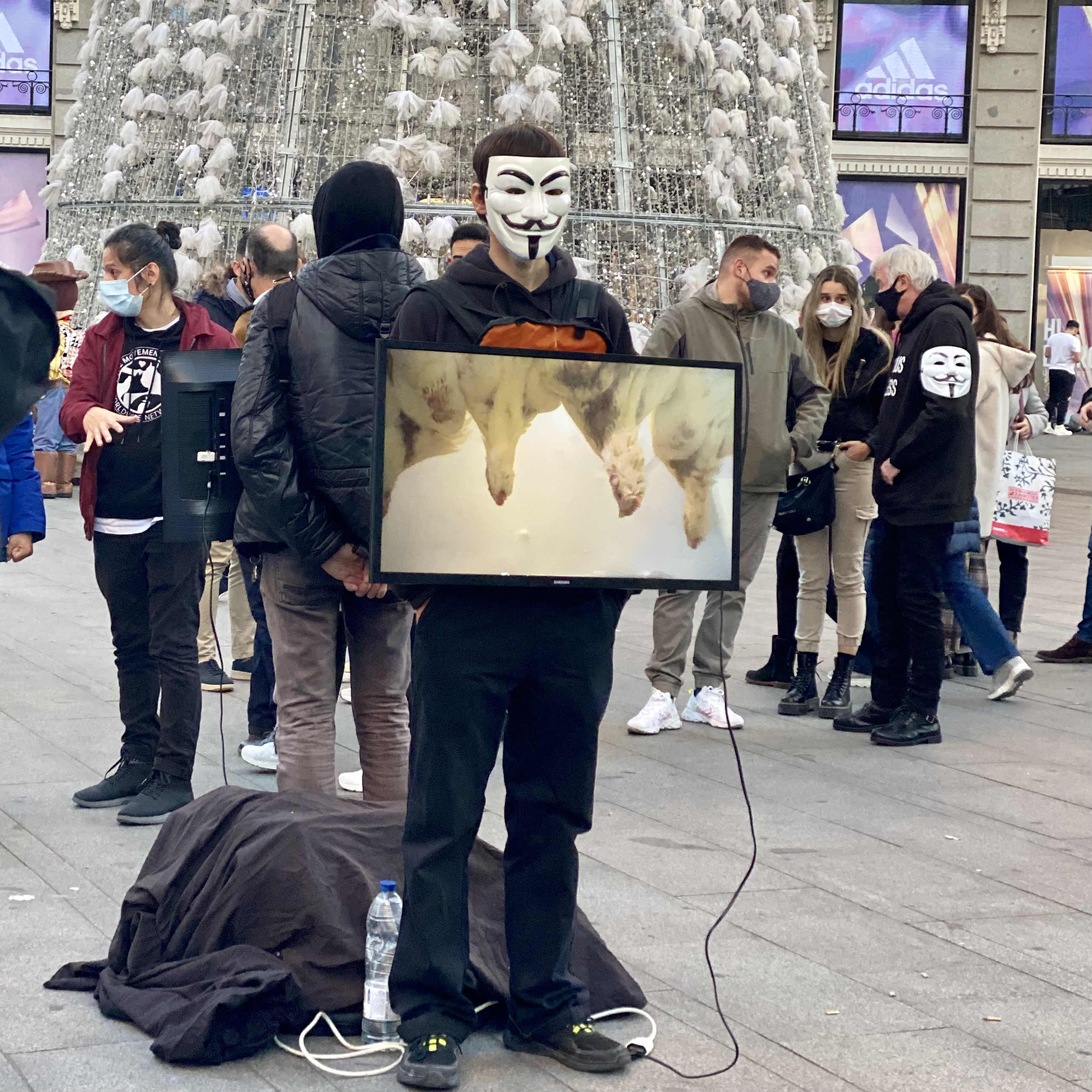 El grupo de activistas Anonymous for the Voiceless (AV), en defensa por los animales, se manifestaron pacíficamente en el centro de Madrid, en Gran Vía. Calle en la que se encuentran las tiendas más relevantes de la ciudad y donde circula un gran número de personas a diario. Ahí rodeados de cientos de personas y cerca de las firmas más importantes del sector industrial, se llevó a cabo una protesta para levantar la voz de los que no tienen, los animales.