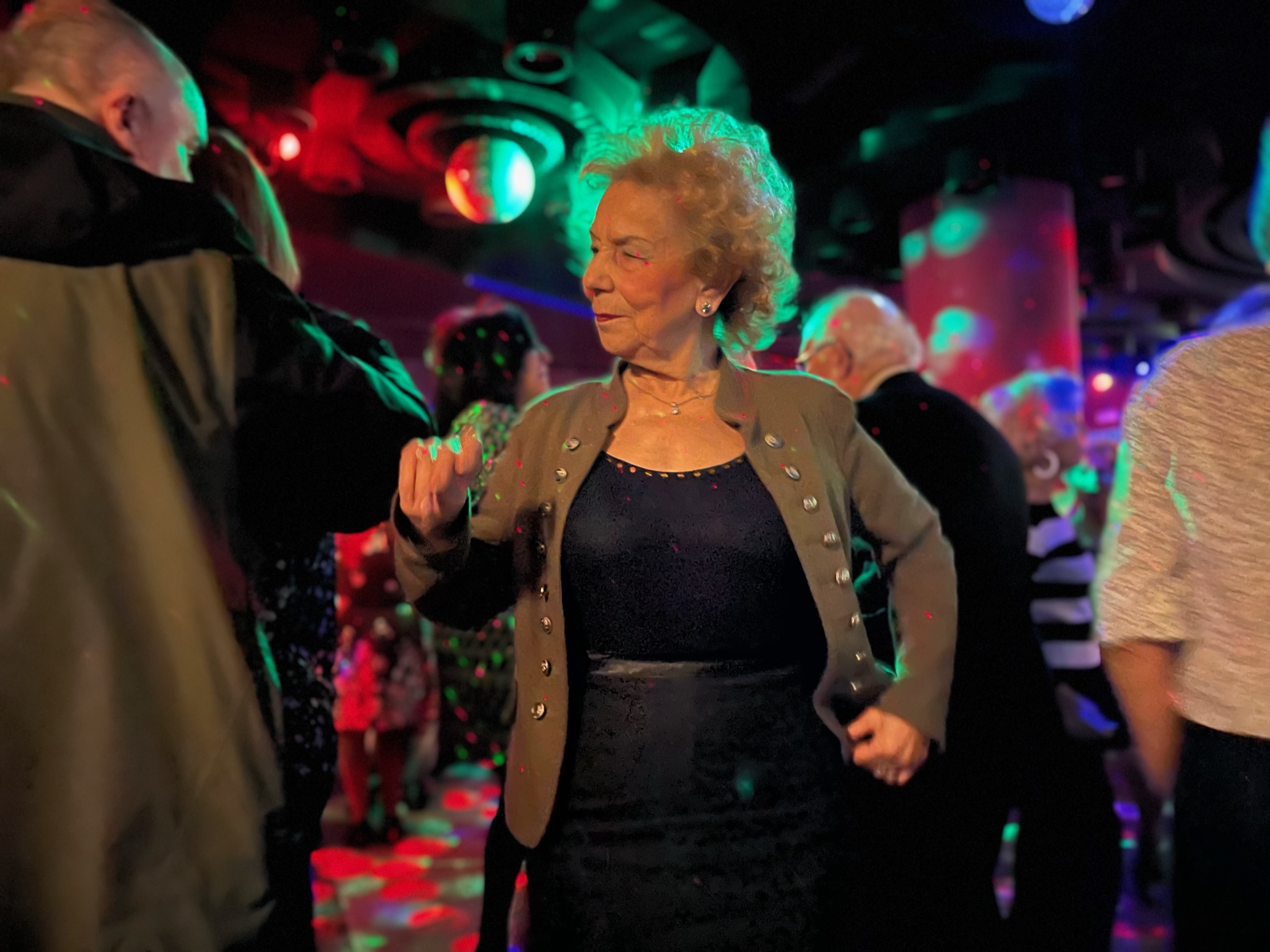 Juani de 82 años es asidua al lugar desde los 49. Ya no baila sin parar las cinco horas que dura la fiesta, porque le aquejan algunos problemas de salud, ahora le gusta más escuchar música y ver el ambiente que transcurre entre música de DJ y la orquesta en vivo. El ritmo fue un placer que Juani descubrió cuando se divorció del padre de sus hijos y comenzó a juntarse con amigas para quedar en las salas de bailes. Explica que es «normal» que en las discotecas para mayores la mayoría sean mujeres. Casi todas viudas y jubiladas a las que les fascina irse de marcha. «Es que no estamos muertas», reclama una señora que lleva el cabello cano con matices color morado. «Siempre nos ha gustado el baile, estamos en la capital de España, cómo no vamos a disfrutar. ¡De Madrid al cielo!», añade eufórica.